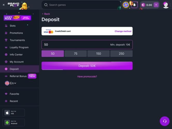 賭場不允許開設多個帳戶,如果玩家建立多個帳戶,營運商有權關閉所有帳戶。 BravoPlay有權自行決定關閉任何已註冊的帳戶。 超過十二個月未使用的帳戶將被視為休眠帳戶。 在驗證程序成功完成之前,賭場有權扣留任何進出玩家帳戶的款項。 業者有權收取存款和提款手續費。 存款只能使用註冊時選擇的貨幣。 每月提款額度有上限。 賭場收銀台支援多種支付方式 ,包括 Visa 和 MasterCard(信用卡和金融卡)、銀行電匯、Apple Pay、Google Pay、Interac、Paysafecard、Skrill、NETELLER、Jeton、AstroPay Card 等。請注意,不同國家/地區的可用選項可能有所不同。