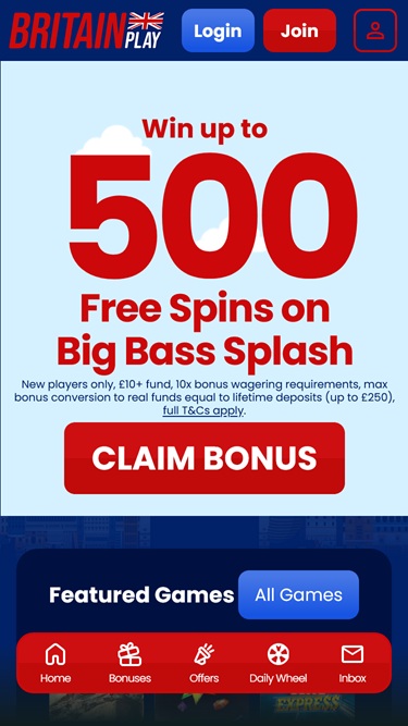 這家賭場擁有一個精美的賭博平台,其設計融入了一些著名的英國符號和元素,包括英國國旗及其配色圖案。對於一個名叫BritainPlay的賭博品牌來說,這樣的設計雖然美觀,但可能略顯突兀。值得一提的是,該運營商主要面向英國玩家。