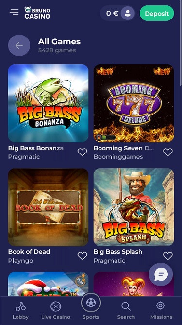 BrunoCasino 提供的遊戲類別有:收藏、熱門、全部、現場、老虎機、輪盤、書籍、累積獎金和桌遊。