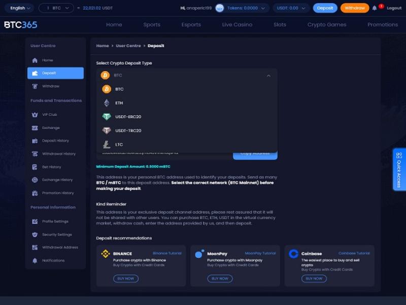 BTC365 賭場支援賭徒可用於存款和提款的各種加密貨幣,所有付款選項都具有出色的提現時間和令人滿意的每月提款限額。