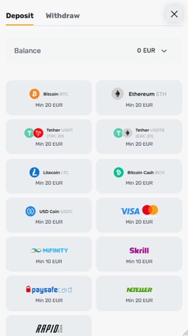 €10 (Crypto/E-wallets)/€20 (Credit/Debit Cards)