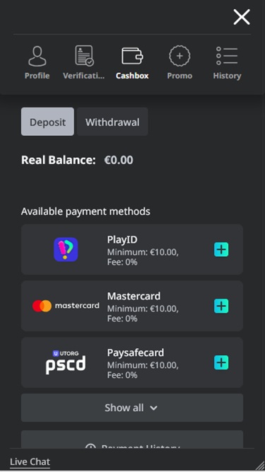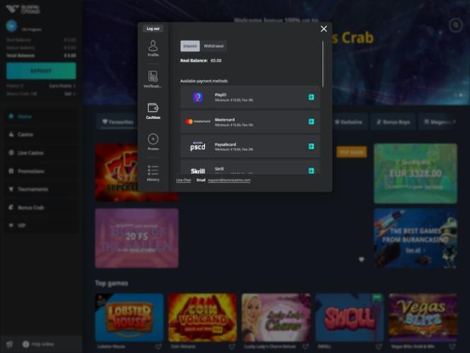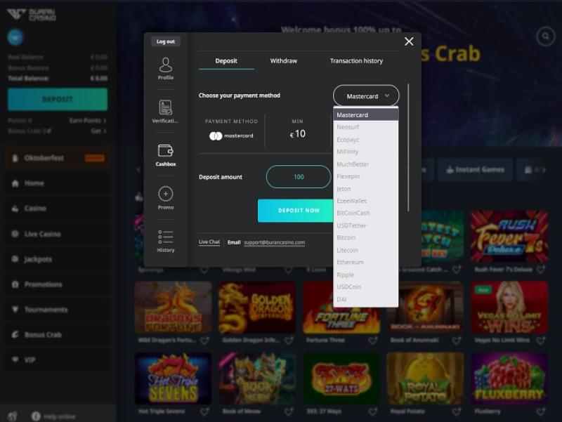 Buran Casino 支援各種值得信賴的支付系統,例如預付卡、金融卡和信用卡、多種電子錢包(包括在某些博彩管轄區流行的電子錢包)、直接轉帳和加密貨幣銀行業務方法。