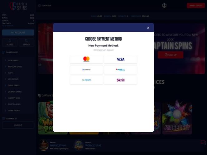 Captain Spins 賭場由 Microgaming, Net Entertainment, Evolution Gaming, EYECON, Play'n GO, playson, Rabcat, Relax Gaming, Wazdan, Pragmatic Play, Nolimit City, Red Tiger Gaming, Fantasma Games, Kalamba, Triple Edge Studios, BGAMING, Northern Lights Gaming, Stormcraft Studios, Switch Studios, Electric Elephant Games, All41 Studios, Gameburger Studios, Pulse 8 Studios, Neon Valley Studios, Golden Rock Studios, SpinPlay Games, GONG Gaming, Blue Guru Games, On Air Entertainment, Buck Stakes Entertainment, Games Global, Push Gaming, Inspired Gaming, Old Skool Studios, Foxium, Just For The Win, Storm Gaming Technology, PearFiction Studios, Wild Streak Gaming, Slingshot Studios, Fortune Factory Studios, AvatarUX, Crazy Tooth Studio, ReelPlay, Alchemy Gaming, Snowborn Games, Hacksaw Gaming, Max Win Gaming, SilverBack Gaming, Peter And Sons, Aurum Signature Studios, Area Vegas, Wishbone Games, Spribe, Print Studios, HammerTime Games, Four Leaf Gaming, INO Games, Nailed It! Games, Neko Games, Reel Kingdom and Oros Gaming提供支持,網站使用網頁平台與您聯繫。玩家可以輕鬆瀏覽網站,找到他們想玩的遊戲。此外,網站還內建行動端支持,方便您在智慧型手機或平板電腦上暢玩。Baccarat