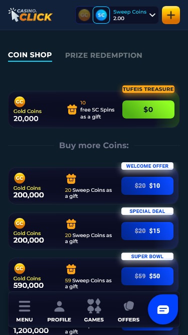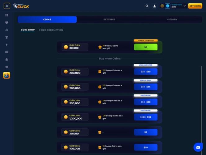 Casino Click 的功能與其他許多抽獎賭場類似。該網站提供兩種虛擬貨幣:金幣和抽獎幣,均可免費獲得。金幣是娛樂貨幣,不可兌換真實獎品。