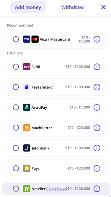一些可用的類別包括Crash Games 、Megaways、Feature Buy,而在真人娛樂場部分,您可以找到遊戲節目、輪盤、二十一點、百家樂、真人撲克遊戲、骰子遊戲、電視遊戲等等。玩家可以在這裡享受高品質的遊戲。