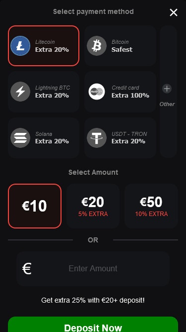 $10 (Crypto)/$15 (Bitcoin)/$30 (Credit/Debit Cards)