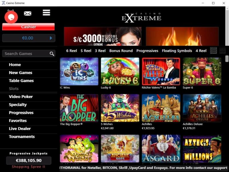 Casino Extreme 提供視訊老虎機和經典老虎機兩種遊戲,數十種選擇供玩家選擇。此外,還有多個累積獎金,獎金金額從幾百美元到一百萬美元不等。