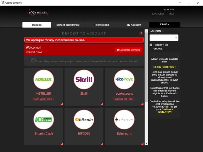 Casino Extreme 的銀行系統非常完善,考慮到該網站服務於美國博彩市場,這一點實屬難得。它提供多種存款和提款方式,包括信用卡和電子錢包。賭場支付獎金迅速,並支持比特幣,玩家幾乎可以立即存入資金。如果說這家賭場的銀行系統有什麼缺點,那就是它限制玩家每周存款額僅為 4,000 美元,但值得注意的是,這項政策不適用於累積獎金。