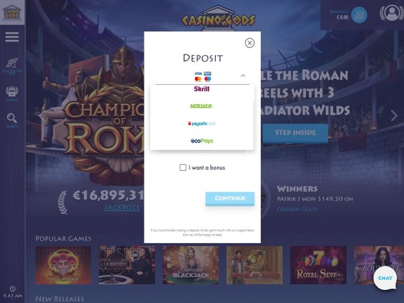Casino Gods 的銀行系統非常出色,透過電子錢包提款可立即到帳。其他方式,例如信用卡和銀行轉賬,則需要更長時間,但這是由於提款方式本身而非賭場的原因。每週獎金提款限額為 5,500 美元,每月限額為 22,000 美元。
