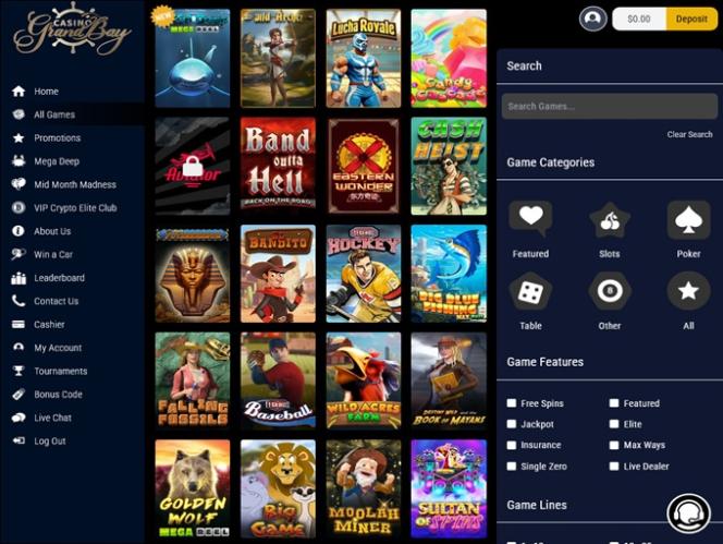 Casino Grand Bay 由 BetSoft, Evolution Gaming, Rival, Saucify and Genii提供支持,玩家可以透過可下載的軟體以及即時播放網路模型存取遊戲。