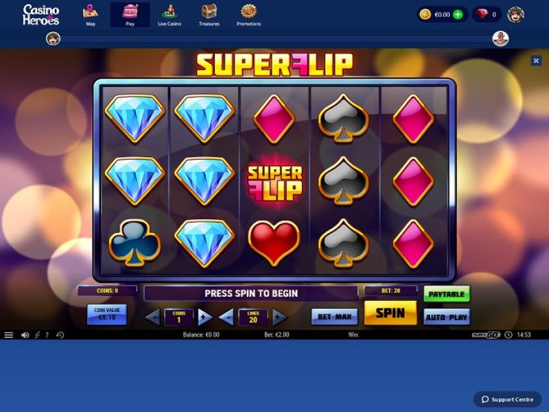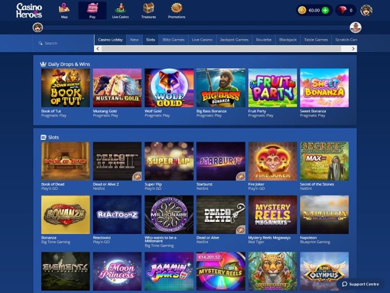 Casino Heroes 由 Microgaming, Net Entertainment, 1x2gaming, Amatic Industries, Barcrest, Big Time Gaming, ELK Studios, Evolution Gaming, Genesis Gaming, iSoftBet, lightningboxgames, Oryx, Play'n GO, playson, Quickspin, Rabcat, Relax Gaming, Thunderkick, Yggdrasil, Wazdan, Realistic Games, Booming Games, Stakelogic, Pragmatic Play, Nolimit City, Red Tiger Gaming, Red Rake Gaming, Skillzzgaming, SYNOT Games, Kalamba, Revolver Gaming, Sigma Gaming, Skywind, Triple Edge Studios, Northern Lights Gaming, Stormcraft Studios, Electric Elephant Games, Pocket Games Soft, Dreamtech Gaming, All41 Studios, Gameburger Studios, Pulse 8 Studios, Neon Valley Studios, Golden Rock Studios, Spearhead Studios, Swintt, TrueLab Games, Shuffle Master, SpinPlay Games, GONG Gaming, Lady Luck Games, Buck Stakes Entertainment, Games Global, Wizard Games, 2by2 Gaming, Blueprint Gaming, NextGen, NYX Interactive, Pariplay, Push Gaming, Inspired Gaming, Gamomat, Scientific Games, Iron Dog Studio, Old Skool Studios, Foxium, Just For The Win, PearFiction Studios, Wild Streak Gaming, Golden Hero, Fortune Factory Studios, Jade Rabbit Gaming, Green Jade Games, STHLM Gaming, 4ThePlayer, AvatarUX, Gamevy, Crazy Tooth Studio, High 5 Games, ReelPlay, Alchemy Gaming, Plank Gaming, BB Games, Snowborn Games, Hacksaw Gaming, Max Win Gaming, Gold Coin Studios, Bang Bang Games, Half Pixel Studios, Arcadem, Slotmill, SilverBack Gaming, Peter And Sons, Aurum Signature Studios, Armadillo Studios and Lucksome Gaming提供支持,透過其網頁平台提供種類繁多的遊戲。一些玩家批評該賭場某些遊戲需要解鎖才能進入,而有些 Boss 戰似乎會拖很久。