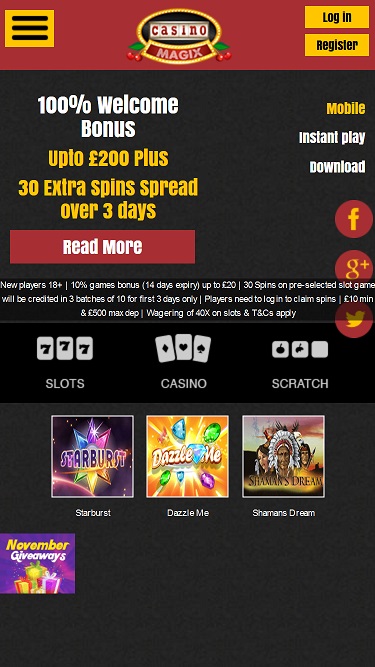 Casino Magix 是一個線上博彩網站,於 2015 年上線,由 Cozygames Management Limited 擁有並營運。該賭場以獎金的低投注要求和快速的支付速度而聞名,在上線後的短時間內便廣受歡迎。賭場資訊
