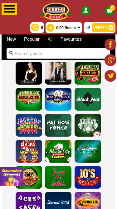 Casino Magix 由 Microgaming, Net Entertainment, EYECON, Genesis Gaming, Thunderkick, Games Global, Wizard Games, Blueprint Gaming, Cozy Games, NextGen and Pariplay提供支持,其遊戲透過網頁平台提供。此外,也為喜歡透過智慧型手機或平板電腦玩遊戲的使用者提供行動網站。Baccarat