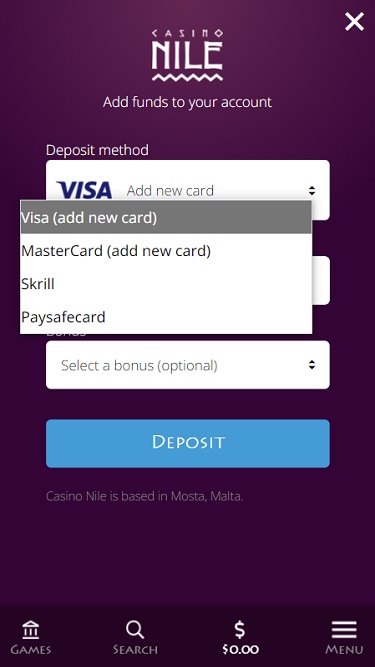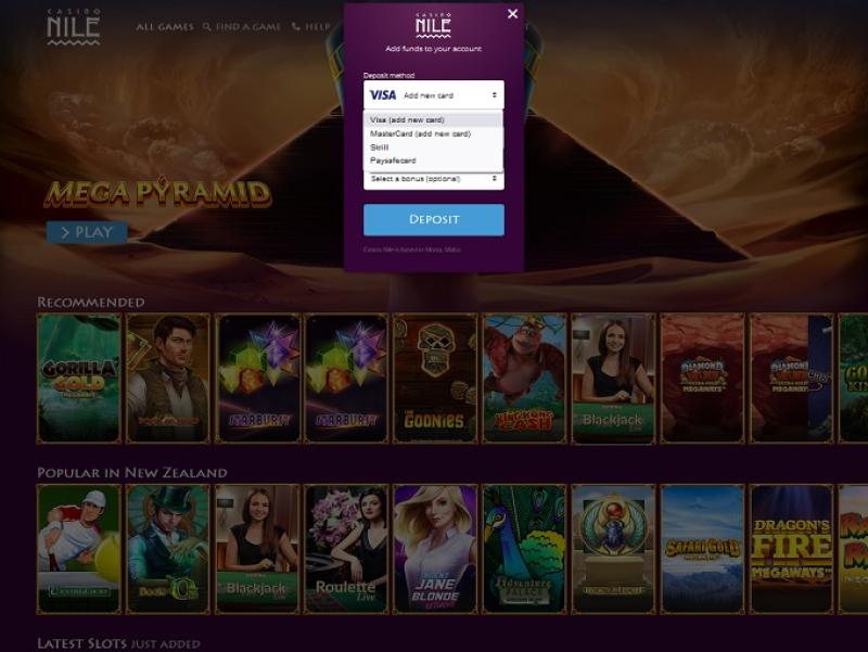 Casino Nile 由 Net Entertainment, Playtech, Barcrest, Big Time Gaming, ELK Studios, Evolution Gaming, lightningboxgames, Play'n GO, Thunderkick, Shuffle Master, Bally Technologies, Blueprint Gaming, Endemol Games, Merkur Gaming, NYX Interactive, WMS, Inspired Gaming, Red7Mobile, Scientific Games, Reel Time Gaming and Rarestone Gaming提供支援。賭場擁有精美的網站,您可以在此註冊、存款、玩遊戲和提款。它完全內建行動支持,讓您可以在智慧型手機或平板電腦上進行博彩。