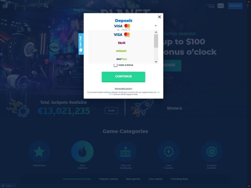 除了標準遊戲外,Casino Planet 還擁有完整的真人荷官部分,為玩家提供二十一點、百家樂、輪盤賭等遊戲的網路直播版本。