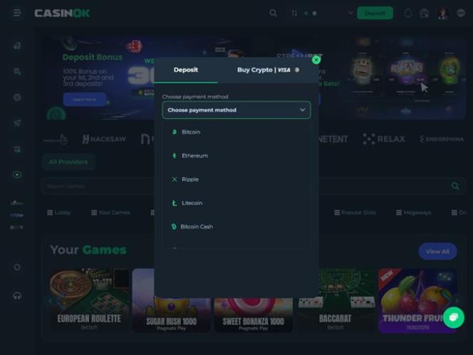正如我們已經提到的,CasinOK 是一個專門以加密貨幣為導向的賭博網站,這意味著您將能夠使用多種加密貨幣選項來管理您的資金,包括比特幣、比特幣現金、達世幣、狗狗幣、以太坊、索拉納幣、萊特幣、美元幣、泰達幣和瑞波幣。