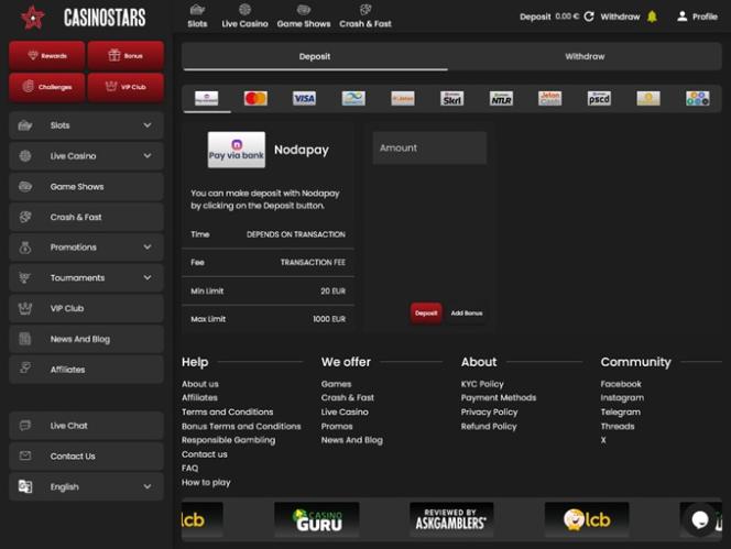 除了回報豐厚的VIP俱樂部外,CasinoStars還為玩家提供豐厚的促銷方案。如果您想在該品牌註冊帳戶,即可獲得豐厚的迎新獎金,幫助您開啟遊戲之旅。現有玩家還可以享受其他多項旨在提升遊戲體驗的促銷活動。