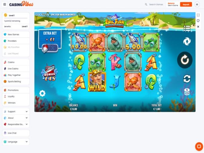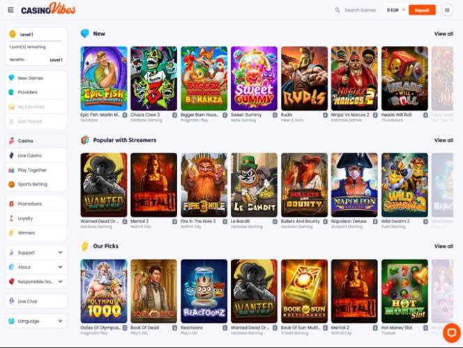 總而言之,CasinoVibes 在外觀和技術方面都是一個全面的賭博環境,但讓我們看看他們在遊戲選擇方面可以為我們提供什麼。