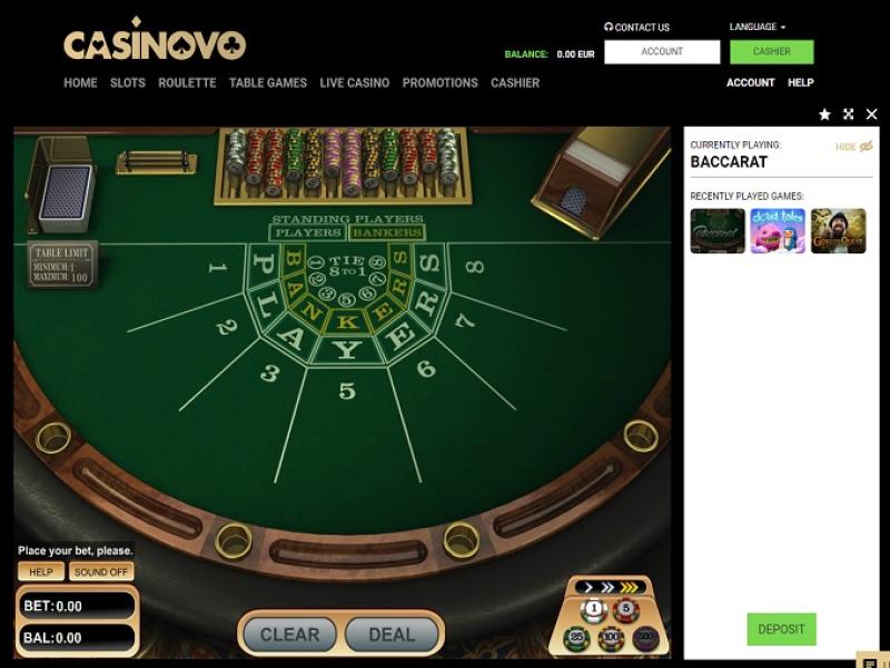 Casinovo 由 Microgaming, BetSoft, Big Time Gaming, Evolution Gaming, Ezugi, Genesis Gaming, iSoftBet, Quickspin, Rabcat, The Art Of Games, Endorphina, Games Global, bluberi and NextGen提供支持,其賭場遊戲透過網路為基礎的平台以及行動網站提供,讓玩家有機會在任何有網路連線的地方玩遊戲。Baccarat