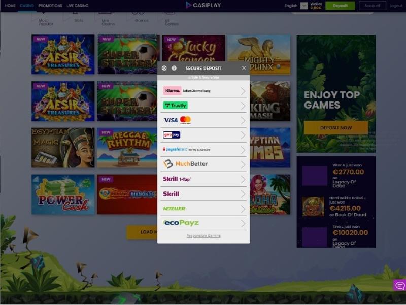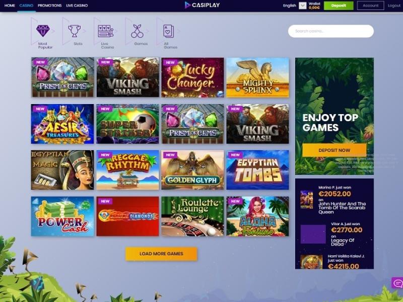Casiplay Casino 由 Amaya, Microgaming, Net Entertainment, BetSoft, 1x2gaming, Big Time Gaming, Evolution Gaming, EYECON, lightningboxgames, Play'n GO, playson, Quickspin, Yggdrasil, Wazdan, Booming Games, Stakelogic, Pragmatic Play, Spinomenal, Red Rake Gaming, Skillzzgaming, SYNOT Games, Skywind, Triple Edge Studios, Northern Lights Gaming, Stormcraft Studios, All41 Studios, Gluck Games, Gameburger Studios, Pulse 8 Studios, Neon Valley Studios, SpinPlay Games, Real Dealer Studios, GONG Gaming, Buck Stakes Entertainment, Games Global, Wizard Games, bluberi, Blueprint Gaming, NeoGames, NextGen, omi-gaming, Pariplay, Inspired Gaming, Gaming Realms, Gamomat, Reel Time Gaming, Authentic Gaming, betiXon, Iron Dog Studio, Old Skool Studios, Foxium, Just For The Win, Reflex Gaming, PearFiction Studios, Wild Streak Gaming, Fortune Factory Studios, RubyPlay, 4ThePlayer, AvatarUX, Gamevy, Crazy Tooth Studio, ReelPlay, Alchemy Gaming, Snowborn Games, Boomerang Studios, Hacksaw Gaming, Bang Bang Games, Slotmill, Peter And Sons, Lucksome Gaming, Area Vegas, Wishbone Games, HammerTime Games, INO Games, Nailed It! Games, Atomic Slot Lab, Neko Games, Reel Kingdom, Oros Gaming and Indigo Magic提供支持,遊戲透過網頁平台提供,可透過您的網頁瀏覽器載入。該網站設計精良,並內建了行動裝置相容性。