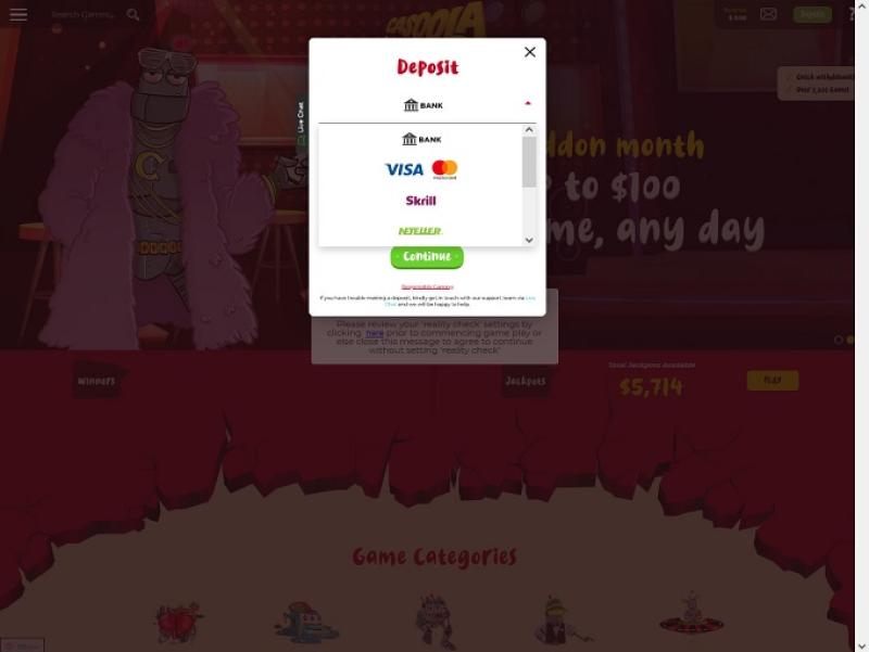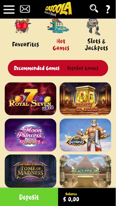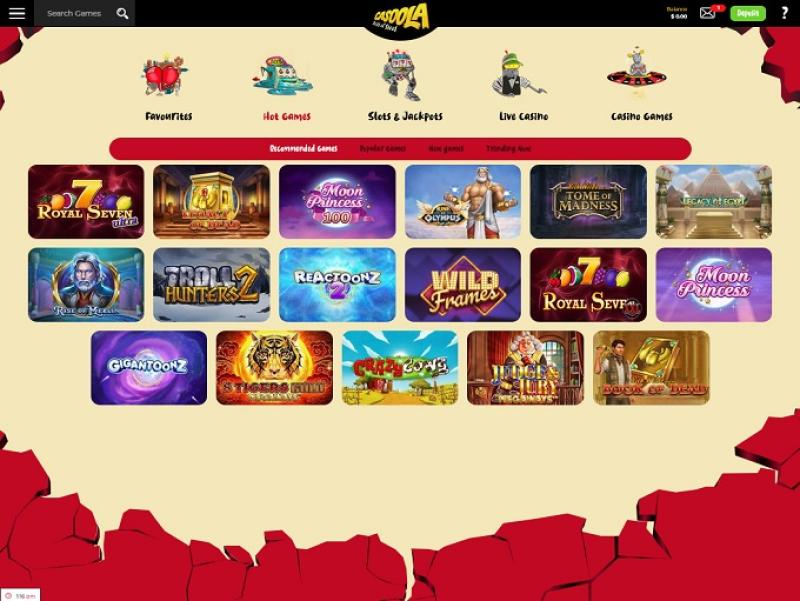 Casoola 由 Microgaming, Big Time Gaming, ELK Studios, Evolution Gaming, Ezugi, lightningboxgames, Oryx, Quickspin, Rabcat, Relax Gaming, Yggdrasil, Wazdan, IGT, Skillzzgaming, Fantasma Games, Kalamba, Sigma Gaming, Skywind, Triple Edge Studios, Northern Lights Gaming, Stormcraft Studios, Electric Elephant Games, All41 Studios, Gameburger Studios, Pulse 8 Studios, Golden Rock Studios, TrueLab Games, Games Global, 2by2 Gaming, NextGen, Push Gaming, Gamomat, CORE Gaming, Foxium, Just For The Win, PearFiction Studios, Slingshot Studios, Golden Hero, Fortune Factory Studios, Crazy Tooth Studio, Half Pixel Studios and Aurum Signature Studios提供支持,其遊戲透過網頁平台進行,美觀又易於瀏覽。我非常喜歡網站的主題,覺得它為這個名字略顯古怪的網站增添了幾分魅力。網站也全面支援行動投注,因此您可以使用智慧型手機或平板電腦參與其中。