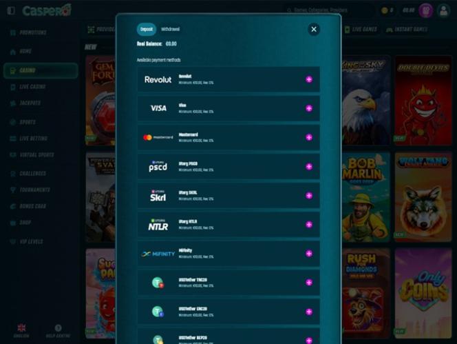 Caspero Casino 為用戶提供多種存款和提款方式。其中包括Visa 、 Mastercard 、銀行電匯、 Skrill 、 Neteller 、 Paysafecard 、 Revolut等傳統支付方式。此外,還提供比特幣、比特幣現金、卡爾達諾、狗狗幣、以太坊、萊特幣、 USD Coin 、泰達幣和瑞波幣等現代加密貨幣選項。