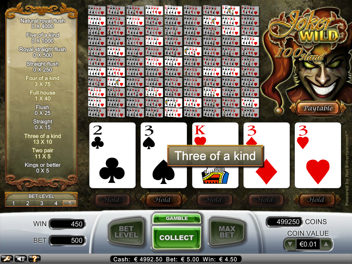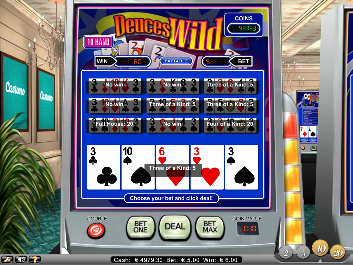![]() Jacks or Better — 1次遊戲 | ![]() Deuces Wild — 10 次遊戲 | ![]() Joker 撲克 — 100 次遊戲 |