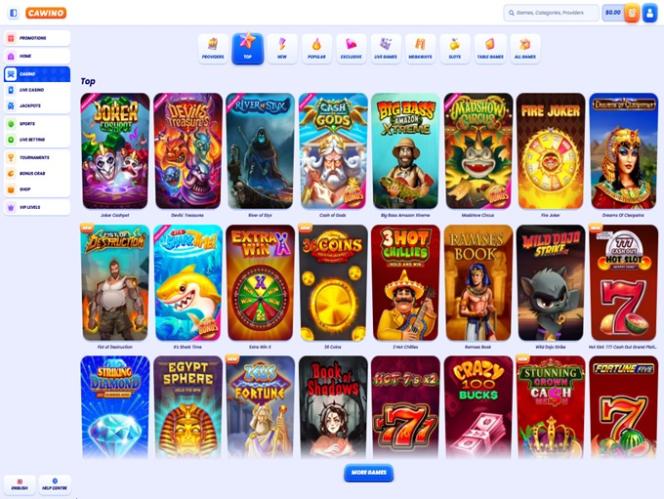 玩家可以在 Cawino 嘗試的一些遊戲包括 Devil's Treasures、Wild Hot 40 Blow、Alien Fruits 2、Joker Cashpot、Fortune Five Double、Juicy Doubles、Lucky Dwarfs、Coin Gobbler、Dreams of Cleopatra、Sugar Fever、Lucky Dwarfs、Coin Gobbler、Dreams of Cleopatra、Sugar Fever、ickyal anzas Fever、icky 三個 B「」下來 - 電話」 Phoenix、Mega Fire Blaze: Rocky、Detective Fortune、Dwarf Mine、Big Bad Wolf、Triton's Realm、Kraken Bay、Amulets of Horus、Wild Tiger、Cash Mine、Moon of Ra: Running Wins、Book of Gods、Divine Empress、Book of Meow、Immor Ways Sweetor Coinor、Cai)。
