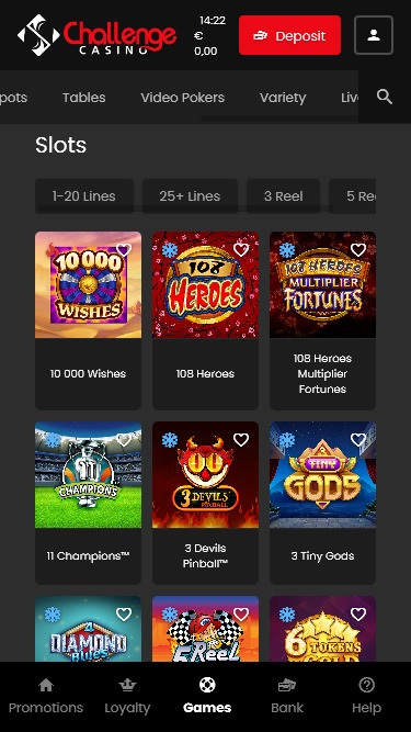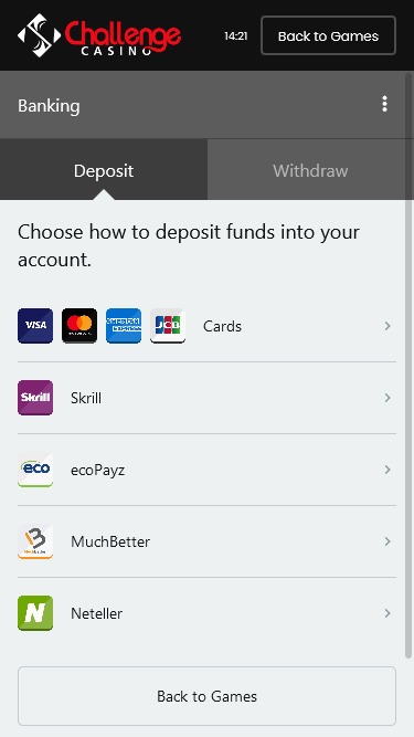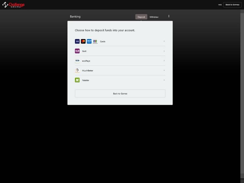 Challenge Casino 由 Microgaming, Evolution Gaming, Rabcat, Triple Edge Studios, Northern Lights Gaming, Stormcraft Studios, Switch Studios, Electric Elephant Games, All41 Studios, Gameburger Studios, Pulse 8 Studios, Neon Valley Studios, SpinPlay Games, Real Dealer Studios, GONG Gaming, Buck Stakes Entertainment, Games Global, Old Skool Studios, Foxium, Just For The Win, PearFiction Studios, Slingshot Studios, Fortune Factory Studios, Crazy Tooth Studio, Alchemy Gaming, Snowborn Games, Gold Coin Studios, Half Pixel Studios, Eurostar Studios and Aurum Signature Studios提供支持,為營運商提供了數百款遊戲庫。賭場透過基於 Flash 的平台提供這些遊戲,您可以在瀏覽器中暢玩,同時也為喜歡直接在電腦上玩遊戲的玩家提供可下載的版本。Baccarat
