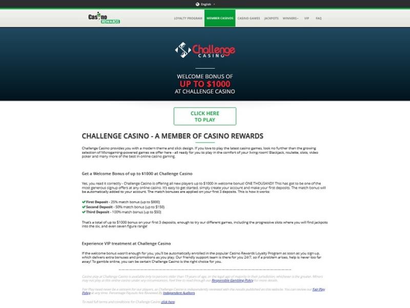 Challenge Casino 由 Casino Rewards 擁有並經營,該公司因推出一些優秀的線上博彩網站而享有盛譽。 Challenge Casino 在英國、Kahnawake 和 eCOGRA 獲得執照,以其豐富的遊戲選擇、卓越的客戶服務和豐厚的累積獎金而備受讚譽,但也因提款需等待 48 小時才能獲得批准而受到批評。賭場資訊