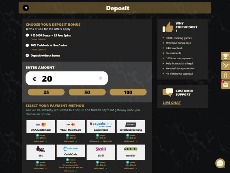 為了確保賭徒的敏感資料和現場支付的安全,ChipsResort 使用了 SSL 加密,這是 iGaming 行業安全標準。