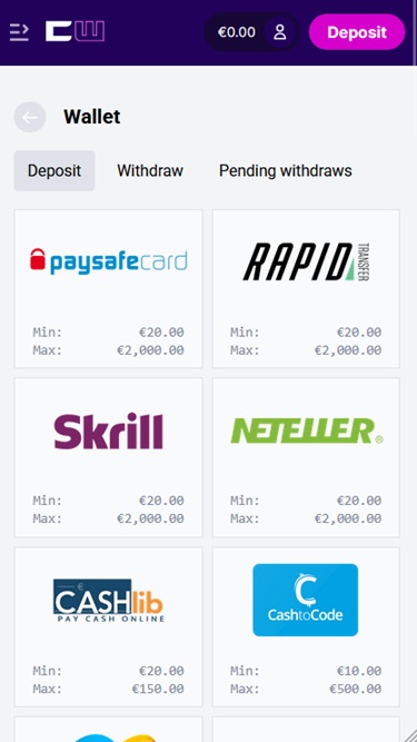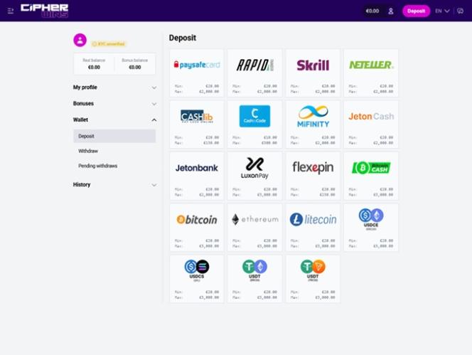 在 Cipher Wins,玩家可以透過多種方式存取帳戶資金。他們可以使用Visa 、萬事達卡、銀行電匯、 AstroPay 、 Skrill 、 Neteller 、 Paysafecard 、 MiFinity 、 Flexepin等付款方式。賭場也接受多種加密貨幣,包括比特幣、比特幣現金、以太幣、萊特幣、泰達幣和美元幣。