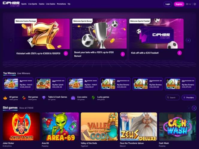 Cipher Wins 是一個現代化的博弈網站,提供豐富多樣的賭場遊戲,包括真錢老虎機、真人荷官、速成遊戲和桌上遊戲。賭場擁有豐富的體育博彩板塊,為用戶提供豐富的投注選擇,以及全面的促銷計劃,提供多種獎金和促銷活動,供玩家盡情享受。
