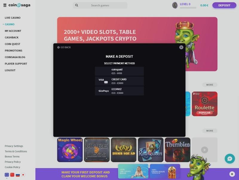 CoinSaga 賭場是一家接受加密貨幣的線上賭場,接受比特幣。提款免費,款項將透過初始存款方式支付到您的帳戶。如果初始存款方式不可用,提款將透過您之前使用的其他付款方式支付。如果提款金額超過 1,000 美元,公司可能會要求您提供KYC 流程所需的文件。