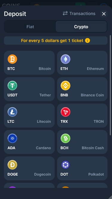 正如我們所提到的,Coins.Game Casino 非常支援加密貨幣!當然,您可以使用一些流行的傳統銀行方式購買加密貨幣,但這裡的主要貨幣是數位貨幣。請注意,可用的付款選項因國家/地區而異。