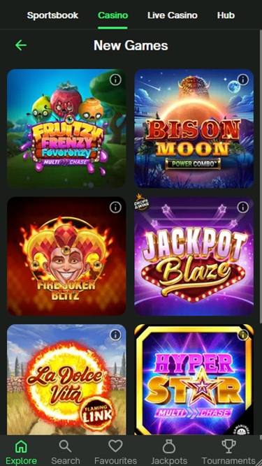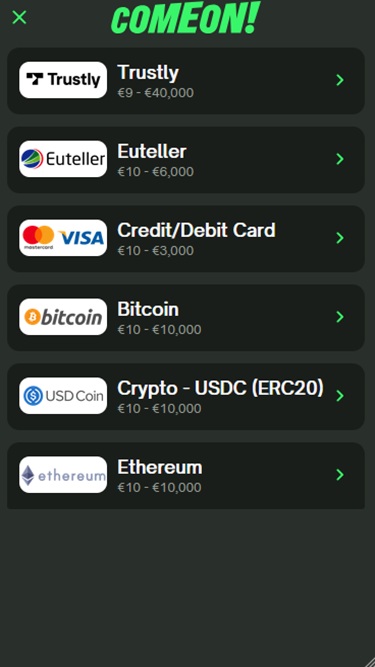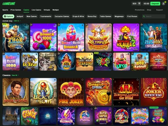 ComeOn 賭場由 Microgaming, Net Entertainment, Playtech, BetSoft, 1x2gaming, Barcrest, Big Time Gaming, Evolution Gaming, Genesis Gaming, lightningboxgames, Oryx, Play'n GO, Quickspin, Rabcat, Relax Gaming, Thunderkick, Yggdrasil, Wazdan, Pragmatic Play, Nolimit City, Red Tiger Gaming, Triple Edge Studios, Northern Lights Gaming, Stormcraft Studios, Switch Studios, Gluck Games, Gameburger Studios, Pulse 8 Studios, Neon Valley Studios, Golden Rock Studios, Shuffle Master, SpinPlay Games, Real Dealer Studios, GONG Gaming, Buck Stakes Entertainment, Games Global, 2by2 Gaming, Blueprint Gaming, NYX Interactive, Push Gaming, WMS, SG Interactive, Gamomat, Red7Mobile, Scientific Games, Authentic Gaming, Iron Dog Studio, Old Skool Studios, Foxium, Just For The Win, PearFiction Studios, Wild Streak Gaming, Slingshot Studios, Fortune Factory Studios, STHLM Gaming, Gamevy, Crazy Tooth Studio, Alchemy Gaming, Boomerang Studios, Hacksaw Gaming, Gold Coin Studios, Bang Bang Games, Half Pixel Studios, Slotmill, SilverBack Gaming, Peter And Sons, Eurostar Studios, Aurum Signature Studios, Armadillo Studios, FlipLuck, Area Vegas, Apparat Gaming and Penguin King提供支持,玩家可以透過營運商的瀏覽器平台暢玩數百款遊戲。 ComeOn 還提供行動平台,讓玩家隨時隨地在智慧型手機和平板電腦上暢玩賭場遊戲。