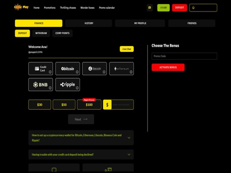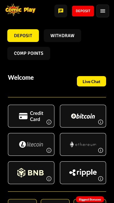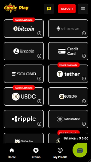 這個美國友善的中心接受BTC支付交易。除了加密貨幣,ComicPlay賭場還提供許多安全的電子錢包選項、標準銀行方法以及支付卡。