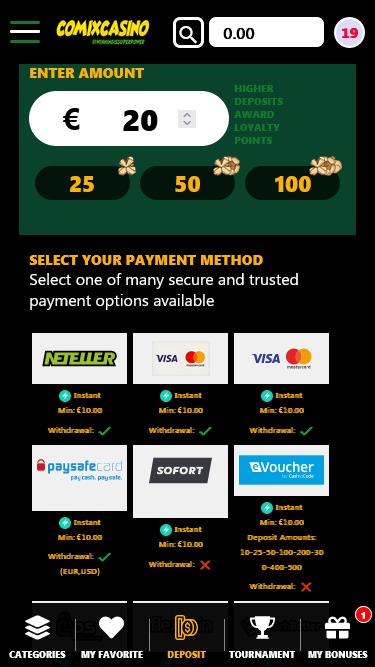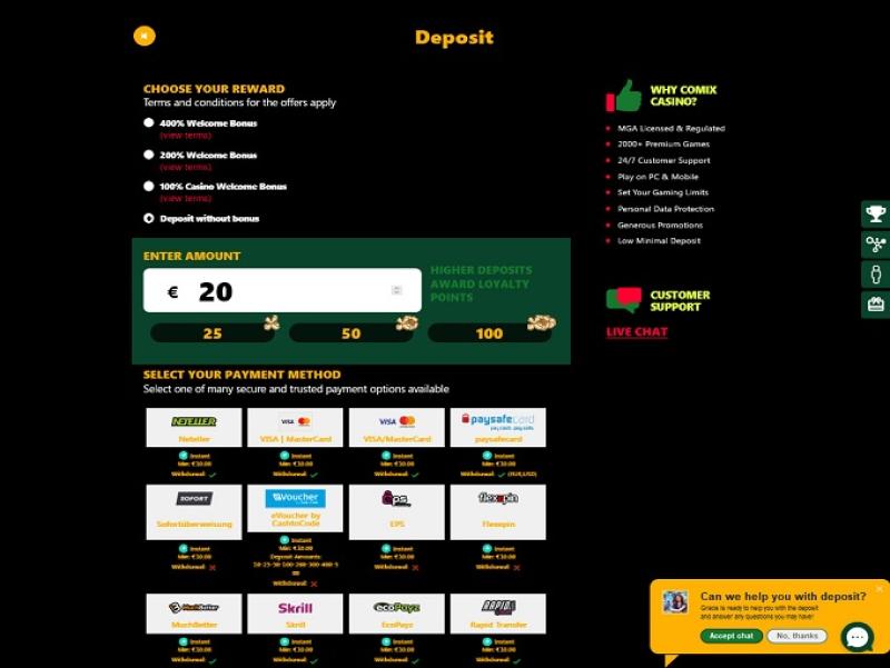 ComixCasino 提供多種可靠的銀行支付方式,例如支付卡、電子錢包、電匯以及在特定地區(拉丁美洲、印度等)流行的多種支付系統。遺憾的是,當我們造訪該網站時,尚未提供加密貨幣支付選項。