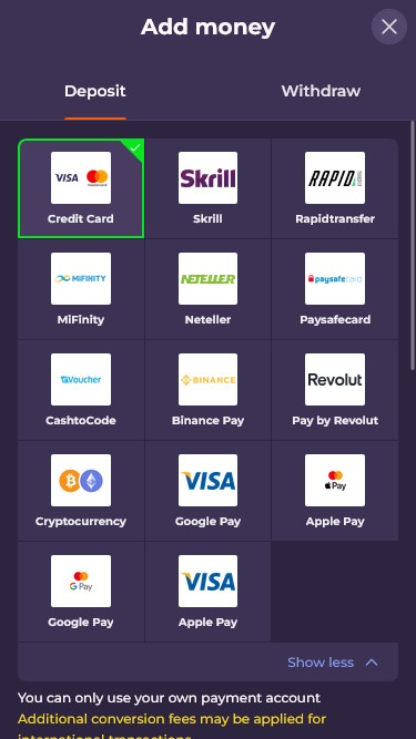 該品牌主要是一個以加密貨幣為導向的賭博網站,接受比特幣、以太幣、波場幣和泰達幣等加密貨幣。同時,它也接受多種傳統銀行支付方式,例如Visa 、萬事達卡、銀行電匯、 Neteller 、 Jeton 、 Skrill 、 Paysafecard等。