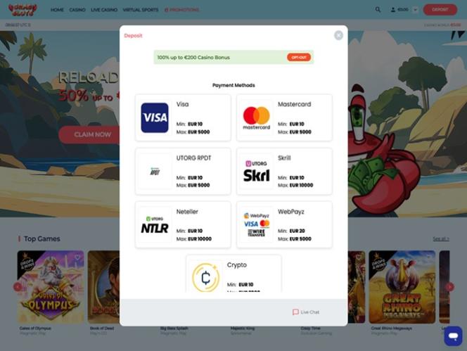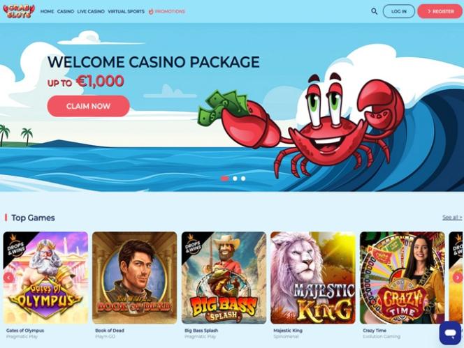 加載網站後,映入眼簾的是令人賞心悅目的淺藍色主題,當然還有一隻螃蟹。頁面左上角是主頁、賭場、真人娛樂場、虛擬體育和促銷菜單。在頁面的另一側—頁面右側,您可以找到您的帳戶餘額和存款選單,如果您尚未登錄,則可以看到登入/註冊按鈕。