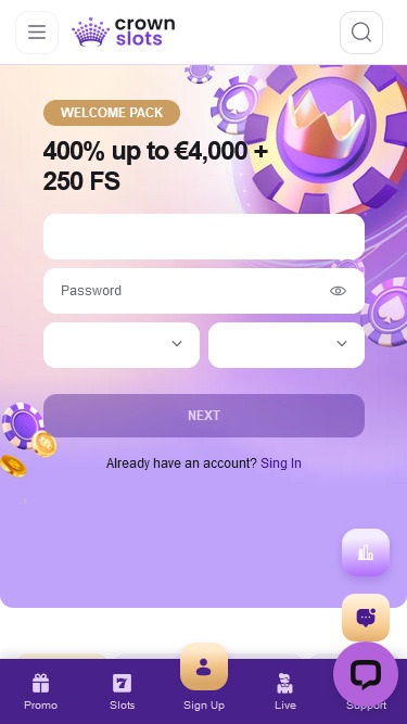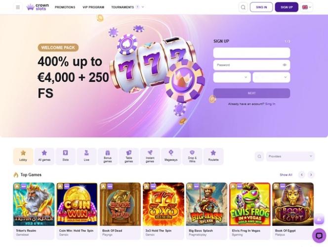 CrownSlots 非常重視使用者體驗,其提供的介面讓我們能夠快速瀏覽整個網站,這一點顯而易見。只需進入主頁,即可存取所有頁面和版塊。中央中央顯示寬幅橫幅,引導玩家註冊,同時宣傳誘人的歡迎禮包。