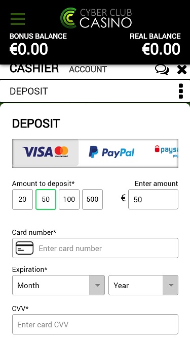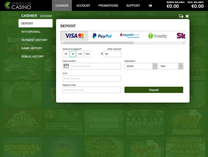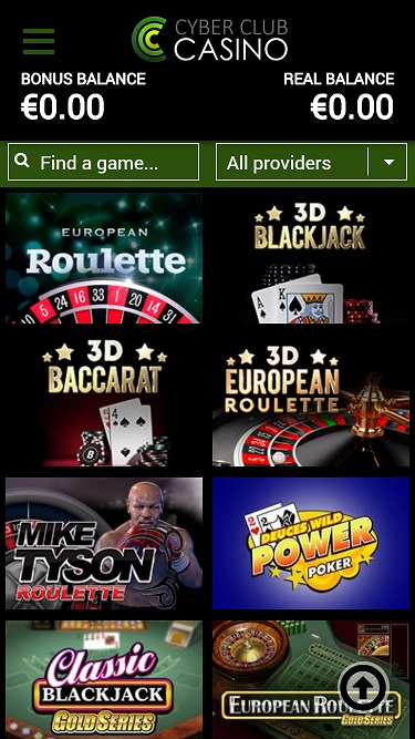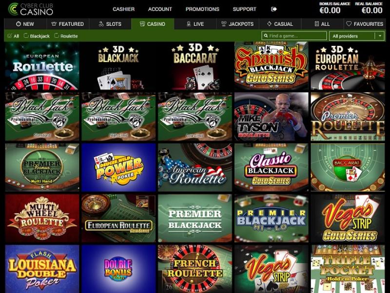 Cyber Club Casino 由 Net Entertainment, BetSoft, Barcrest, ELK Studios, Ezugi, lightningboxgames, Play'n GO, Quickspin, Thunderkick, Realistic Games, Bulletproof Games, Aristocrat, Blueprint Gaming, Leander Games, NextGen, Inspired Gaming, White Hat Gaming, SG Interactive, Betdigital, Bla Bla Bla Studios and MetaGU提供支持,其賭場遊戲透過基於網路的平台以及行動網站提供。