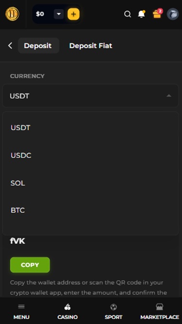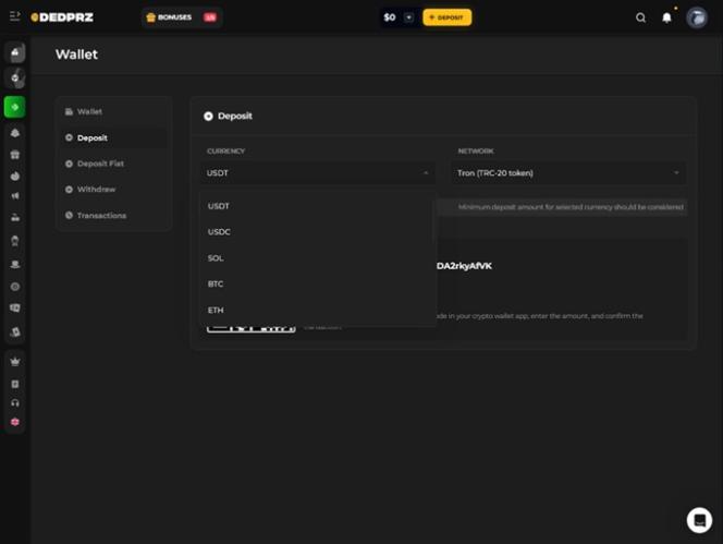 DEDPRZ 賭場是一個加密貨幣專屬平台,僅接受加密貨幣作為有效的存款和提款支付方式。替代交易選項包括比特幣、以太幣、 Solana 、 Tether 、 Tron和USD Coin等眾多貨幣。遺憾的是,信用卡和電子錢包等傳統銀行服務暫不支持。