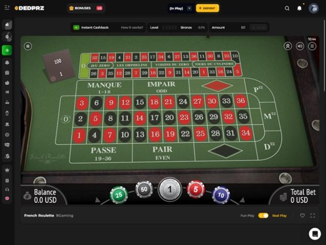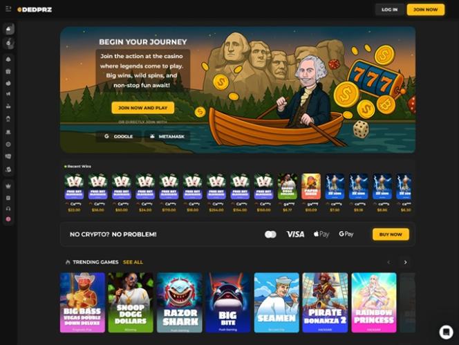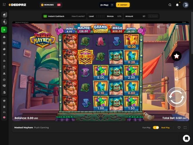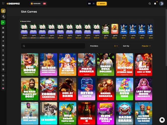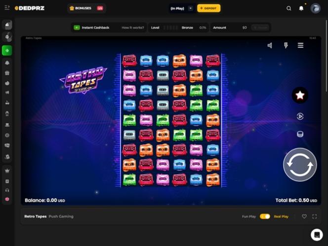 DEDPRZ 也不例外。它的平台具備極簡主義賭場的所有必備元素,並且完美地切中要點,讓用戶輕鬆便捷地瀏覽網站。深色背景與多種霓虹色形成鮮明對比,恰如其分地突出了賭場的其他版塊和頁面。