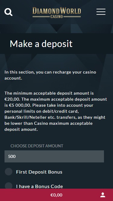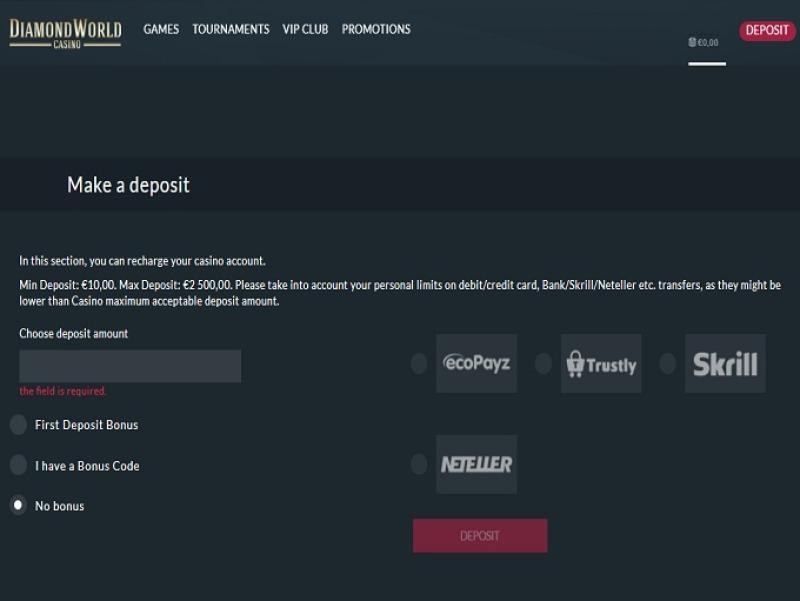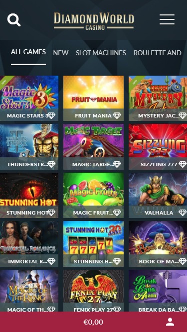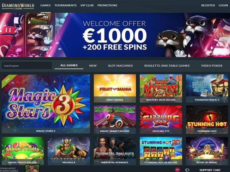 Diamond World Casino 是一個線上博彩網站,於 2012 年開業,由 Fair Play Bets Limited 擁有並經營。該賭場專注於歐洲市場,提供在任何遊戲中均可贏取的熱門累積獎金以及基於硬體的隨機數生成器,但由於提款次數限制以及要求玩家下載 Unity 插件而受到批評。賭場資訊