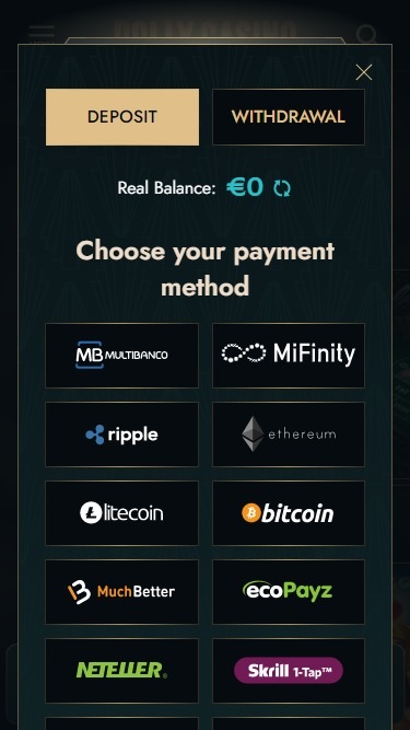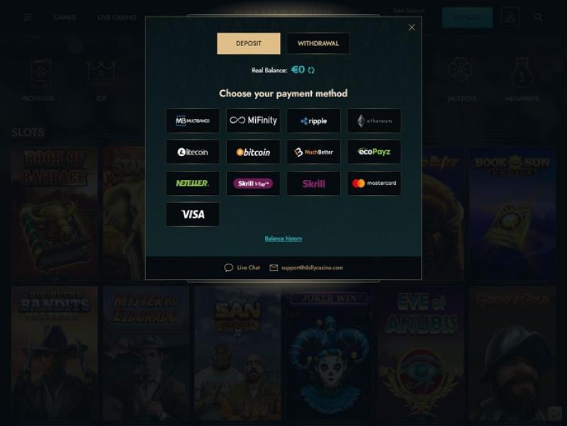Dolly賭場提供多種銀行存款和提款方式。玩家可以存取其玩家控制面板,並從其所在地區提供的眾多付款選項中進行選擇,包括加密貨幣支付選項、支付卡、電子錢包和銀行轉帳。