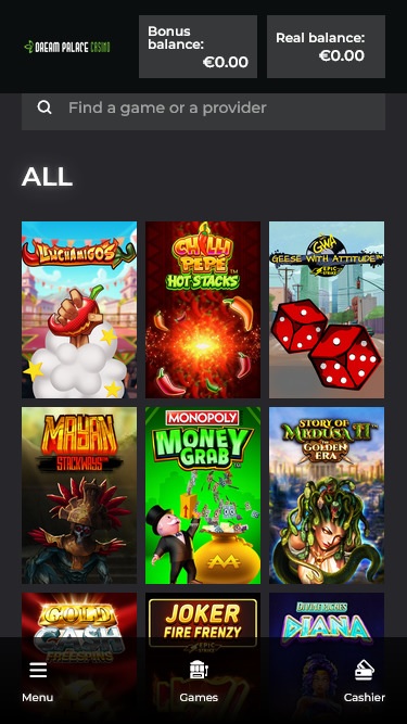 夢幻皇宮賭場 (Dream Palace Casino) 提供數百台老虎機,其中包括數十款授權遊戲以及更多由開發商精心設計的獨特遊戲。小額累積獎金選項也讓玩家有機會贏取巨額現金獎勵。