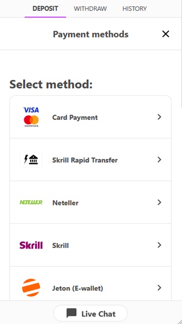 該公司提供多種付款方式,最高存款額取決於所選方式。網站的內部營運貨幣為歐元,所有存款必須至少下注3次才有資格提款。