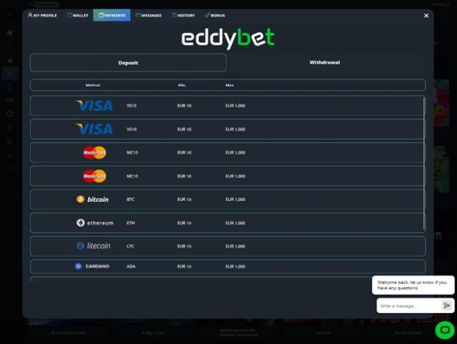 在玩家等待忠誠度計畫之際,EddyBet 賭場決定為玩家提供豐厚的促銷材料,包括眾多促銷活動和獎金,以保持遊戲的趣味性。建立帳戶後,即可領取迎新獎金,這是一項存款匹配促銷活動,旨在讓您以時尚的方式開啟您的首次遊戲。