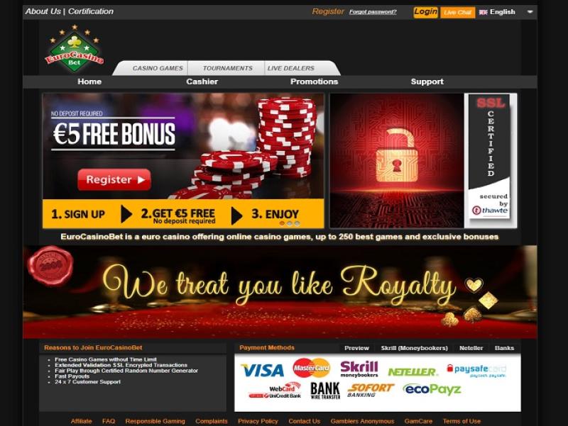 EuroCasinoBet 是一個線上博彩網站,由 EuroCasinoBet Ltd. 於 2008 年創立。該網站主要面向歐洲博彩市場,提供數十款來自受監管軟體開發商的遊戲。由於提供豐富的獎金,並擁有一支強大、能夠持續處理賠償的管理團隊,該網站過去一直深受客戶好評。賭場資訊